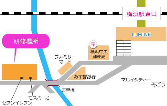 ※研修場所が地図の場所と異なる場合もございます。その場合、基本的には横浜駅から徒歩数分の場所になります。ご了承ください。